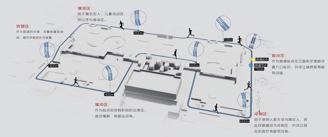 分为起点区、缓冲区、冲刺区、休息区四个区域,每隔几米设置照明灯具,且每100米设置具有激励作用的里程标识,最大化满足人们的健身需求。