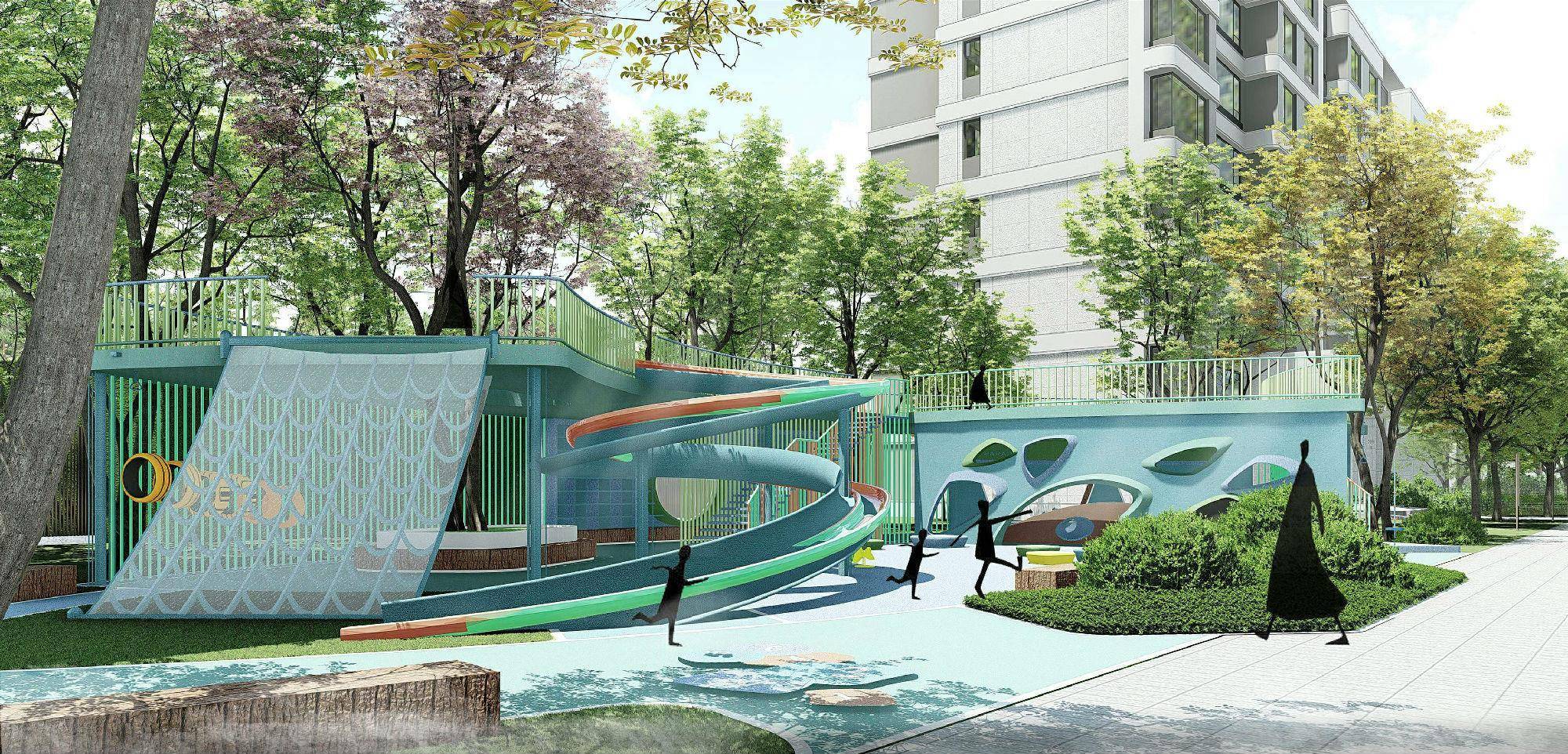 项目结合国际先进理念,融合功能、安全、趣味、体验、互动五位一体,在半遮阴式的场地设计出老人儿童活动区,赋予了空间更多的可能性。