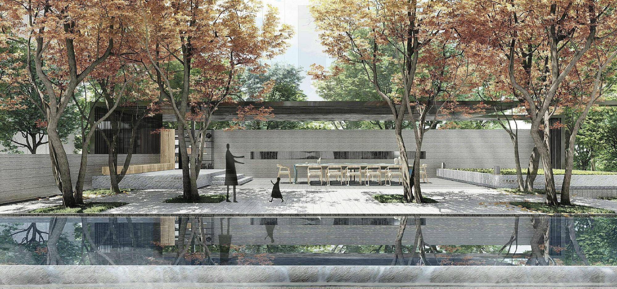 为了增加会客体验感,将廊架落于镜面水景之上,会客厅和树阵倒映在水中,仿佛会客厅生长在树林立面,清风拂面、树影斑驳,而且还是一个集读书、会客于一体的休闲场所。